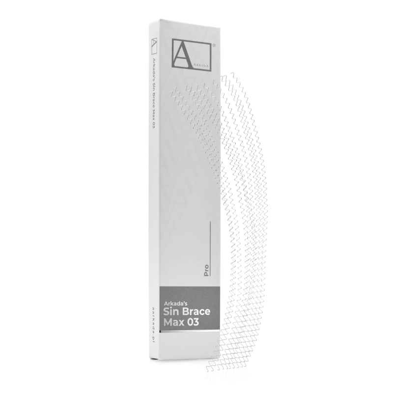 Zestaw dziesięciu kawałków drutu korekcyjnego o średnicy 03, w kształcie dużej fali sinusoidalnej. Dedykowany do tworzenia klamer indywidualnych, pozwalających na korekcję paznokci problematycznych u stóp. Klamrę wyróżnia większa amortyzacja pozwalająca na aplikację u osób bardzo aktywnych. Materiał wykorzystany do produkcji SinBrace Max to stop stali nierdzewnej 316 L stosowany we wszystkich klamrach AArkada. Materiał: Stal nierdzewnaDługość jednego kawałka: 25 cmŚrednica: 0,3 mm