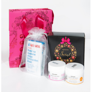 Zestaw prezentowy jest zapakowany w elegancką świąteczną torebkę z napisem Gehwol.